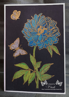 Today a totally different card for you. I have been working with the water color pencils from Nuvo. Great quality and they work very well. This time I didn't work on water color paper but on normal black cardstock. Takes some adjustment but fun to do. Hope you like the result, enjoy.